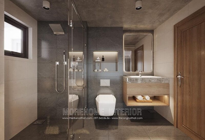 Mẫu thiết kế phòng tắm hiện đại ốp đá màu xám với các thiết bị vệ sinh hiện đại kết hợp vách tắm kính cường lực tạo điểm nhấn cho căn phòng