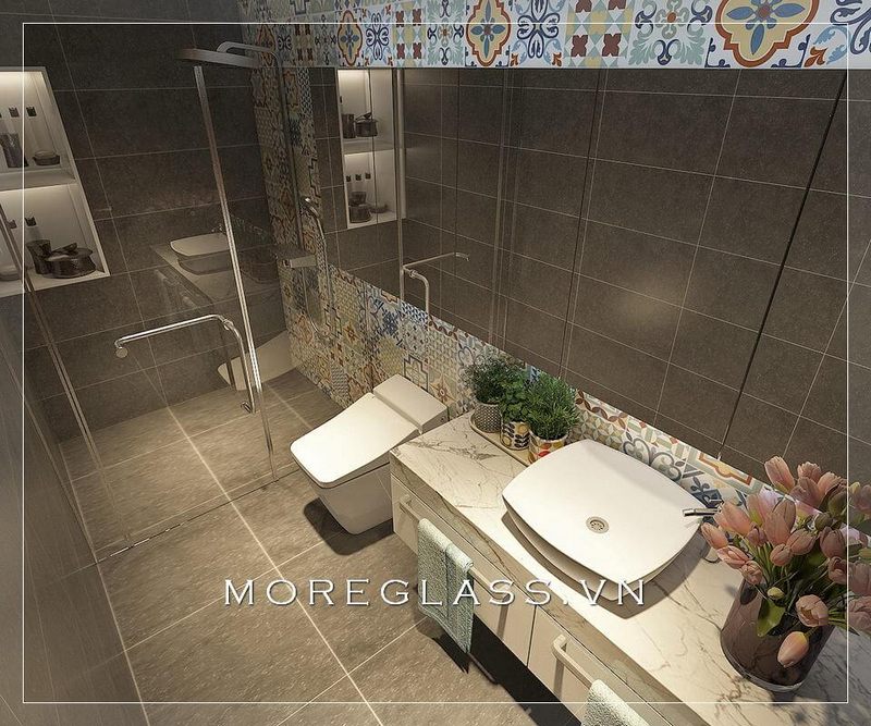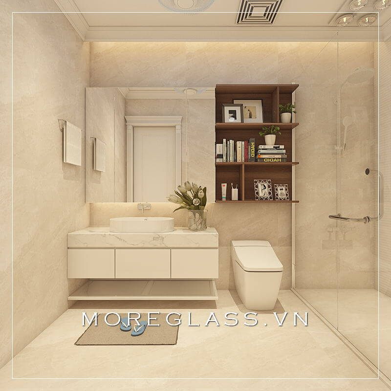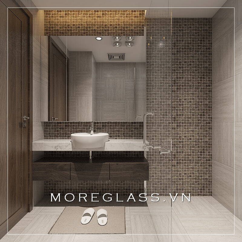 Thiết kế phòng tắm chung cư hiện đại, nhẹ nhàng với nội thất từ kính, đá, gương treo giúp không gian rộng thoáng hơn.