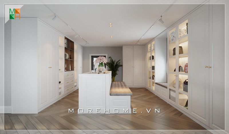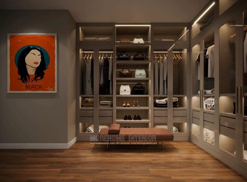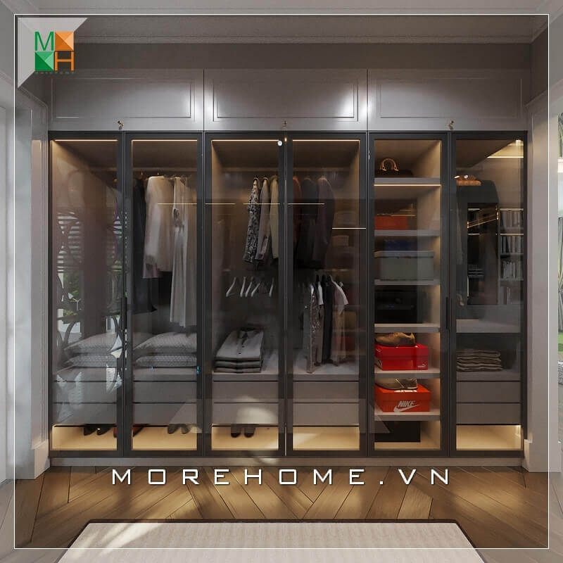 Phòng để đồ riêng biệt với hệ thống tủ hiện đại âm tường giúp không gian gọn gàng, sang trọng trong việc kết hợp kính trẻ trung.