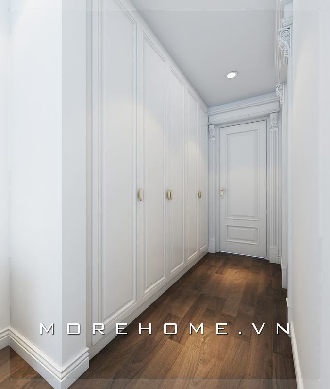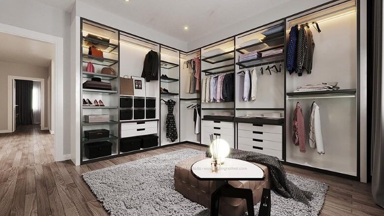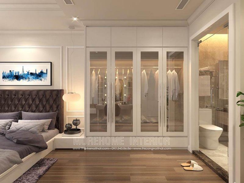 Phòng để đồ riêng biệt với hệ thống tủ hiện đại âm tường giúp không gian gọn gàng, sang trọng trong việc kết hợp kính trẻ trung.