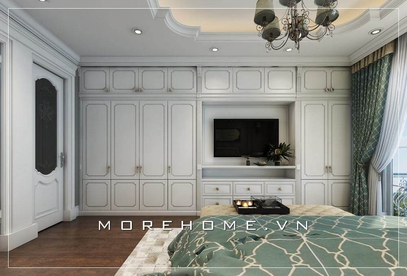 Thiết kế tủ quần áo phòng ngủ biệt thự phong cách tân cổ điển, từng đường nét chạm khắc tinh tế mang đến sự sang trọng cho căn phòng
