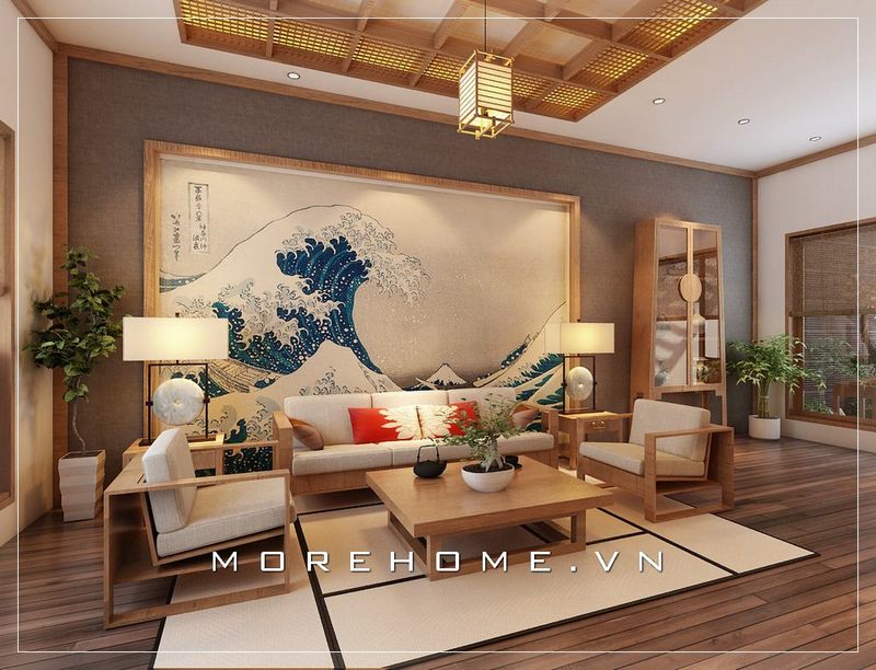 Thiết kế phòng khách chung cư phong cách Nhật Bản ấn tượng với cách lựa chọn bức tranh treo tường treo tường sắc xanh nổi bật giữa một không gian gỗ mộc mạc.