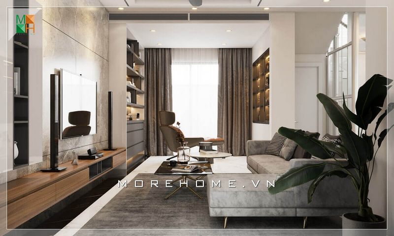 Thiết kế phòng khách chung cư cao cấp không quá cầu kỳ vào từng chi tiết trang trí, hầu hết các hình khối và đường nét sử dụng là các chi tiết đơn giản nhưng vẫn đảm bảo được sự sang trọng và tiện nghi của không gian này