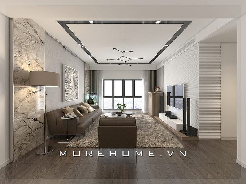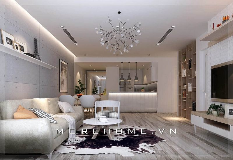 Phòng khách căn hộ chung cư sang trọng tinh tế với thiết kế sofa góc hiện đại bọc da tone trắng cao cấp tối ưu không gian.