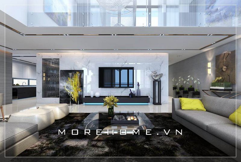 Kệ tivi gỗ công nghiệp ấn tượng kết hợp chân trụ sắt độc đáo tạo vẻ đẹp sang trọng cho phòng khách biệt thự hiện đại.