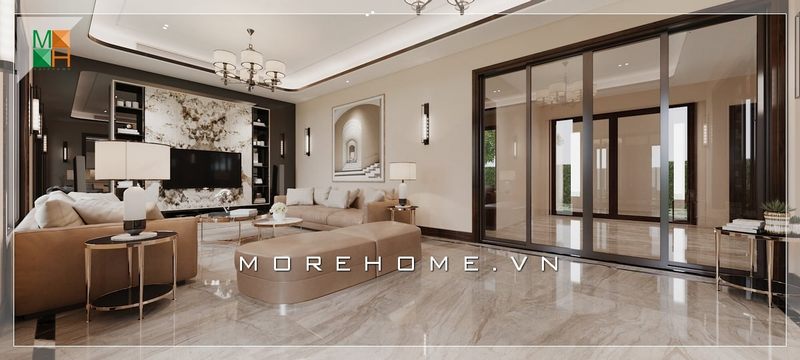 Sự hiện đại của không gian phòng khách nhờ một phần vào sự có mặt của các mẫu cửa kính thông thoáng làm tăng độ tiện nghi cho không gian nơi đây.