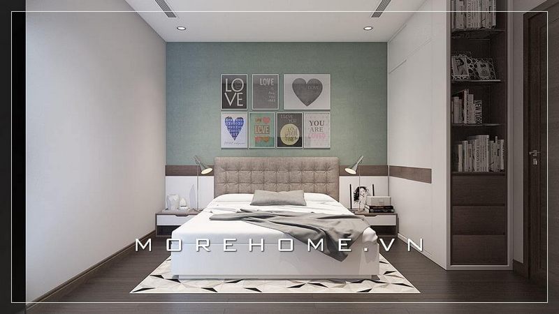 Giường ngủ gỗ công nghiệp màu trắng đầy trẻ trung, tinh tế, phần đầu giường bọc vải màu xám ấn tượng vừa tạo điểm nhấn, vừa mang lại sự thoải mái tựa lưng của gia chủ