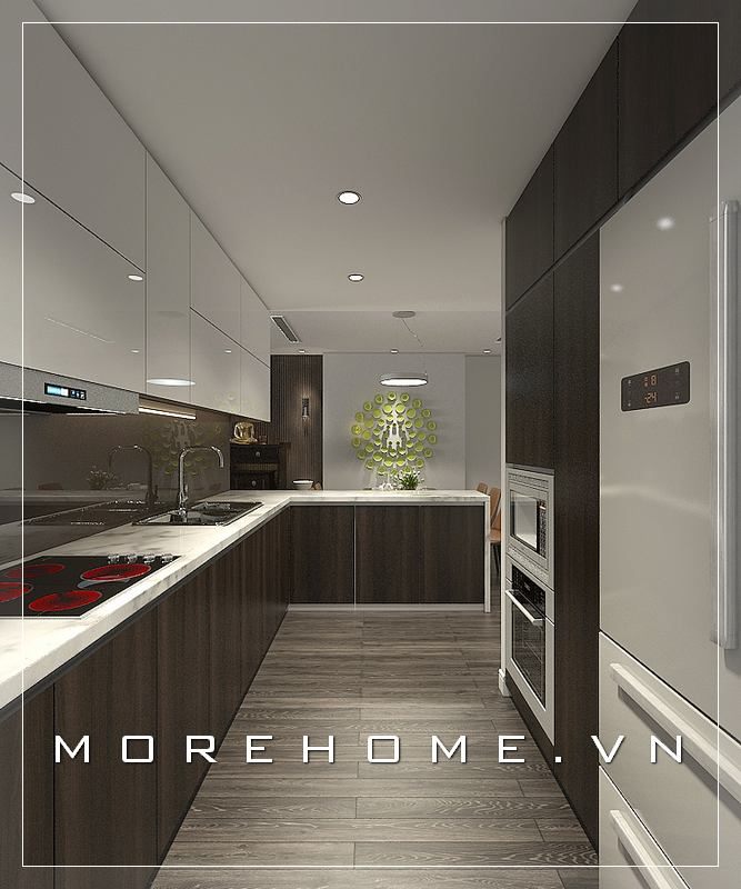 Mẫu thiết kế phòng bếp hiện đại trẻ trung được sử dụng nhiều đá trắng vân mây để ốp bàn, tường bếp. Bàn đảo là điểm nhấn thú vị không thể bỏ qua của phòng bếp này.