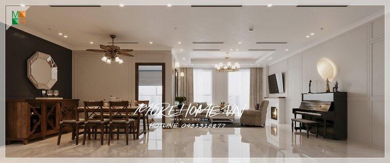 Để tạo ra những điểm nhấn đặc sắc, phòng được trang trí bằng một chiếc gương lục giác treo tường có nhiều tính năng sử dụng. Ngoài ra, một chiếc đàn piano được đặt ở đây cũng mang lại giá trị tinh thần cao cho gia chủ.