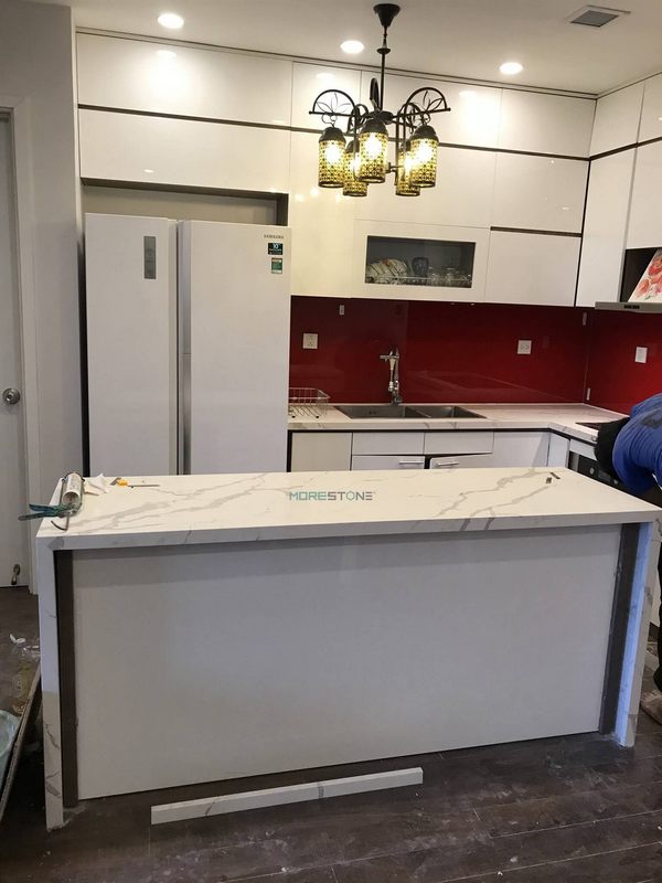 Người thợ MoreStone đã hoàn thành công trình thi công đá ốp bếp Casla tại chung cư cao cấp.
