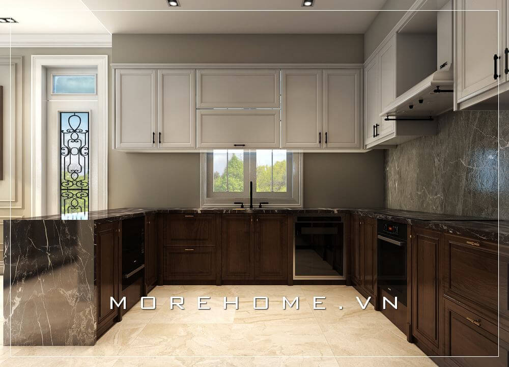 Tủ bếp biệt thự với kiểu dáng chữ u có nhiều không gian rộng, gia chủ có thể dễ dàng nấu nướng nhanh chóng và thuận tiện hơn