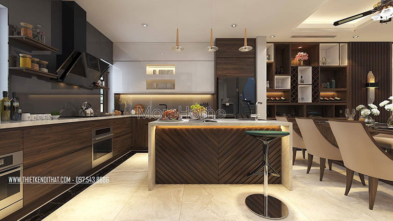 Thiết kế nội thất phòng bếp đẹp với chất liệu gỗ tự nhiên, đá ốp bàn bếp, tủ rượu,...