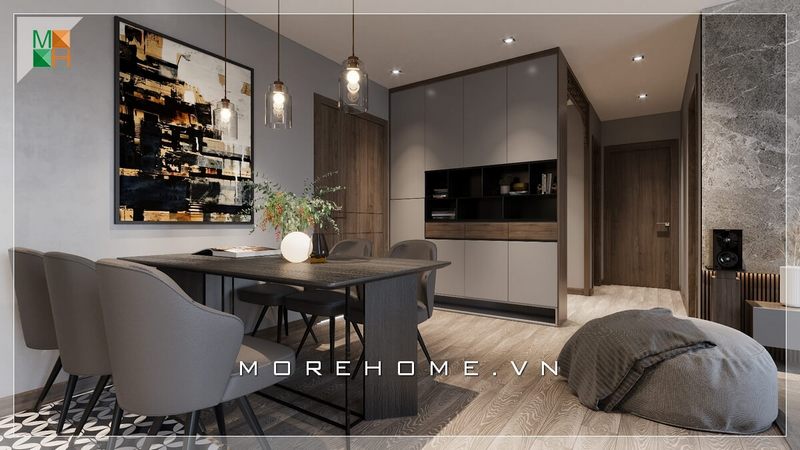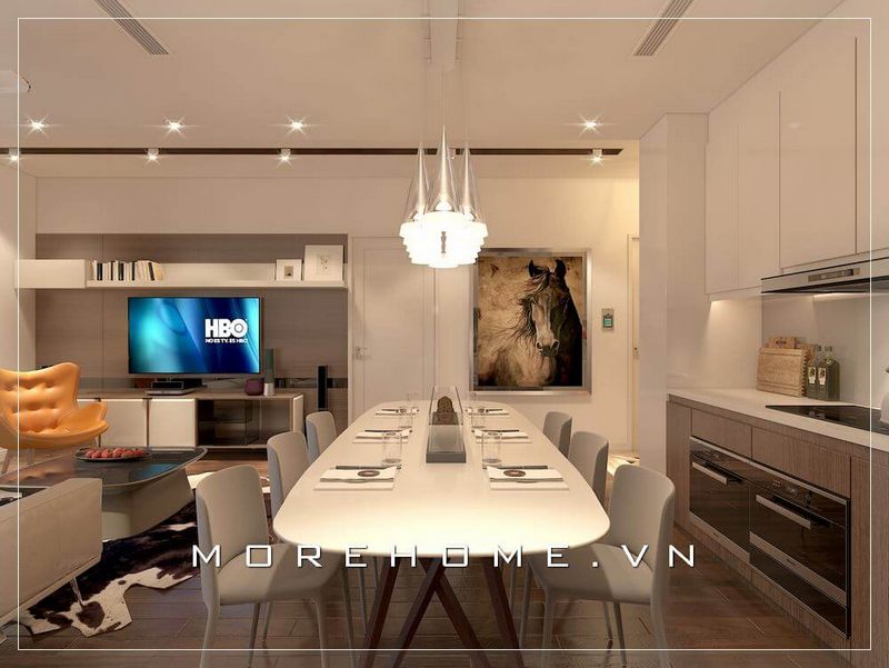 Bộ bàn ăn hiện đại, gọn gàng tiện lợi là lựa chọn hoàn hảo cho phòng ăn liền phòng bếp của không gian căn hộ chung cư.